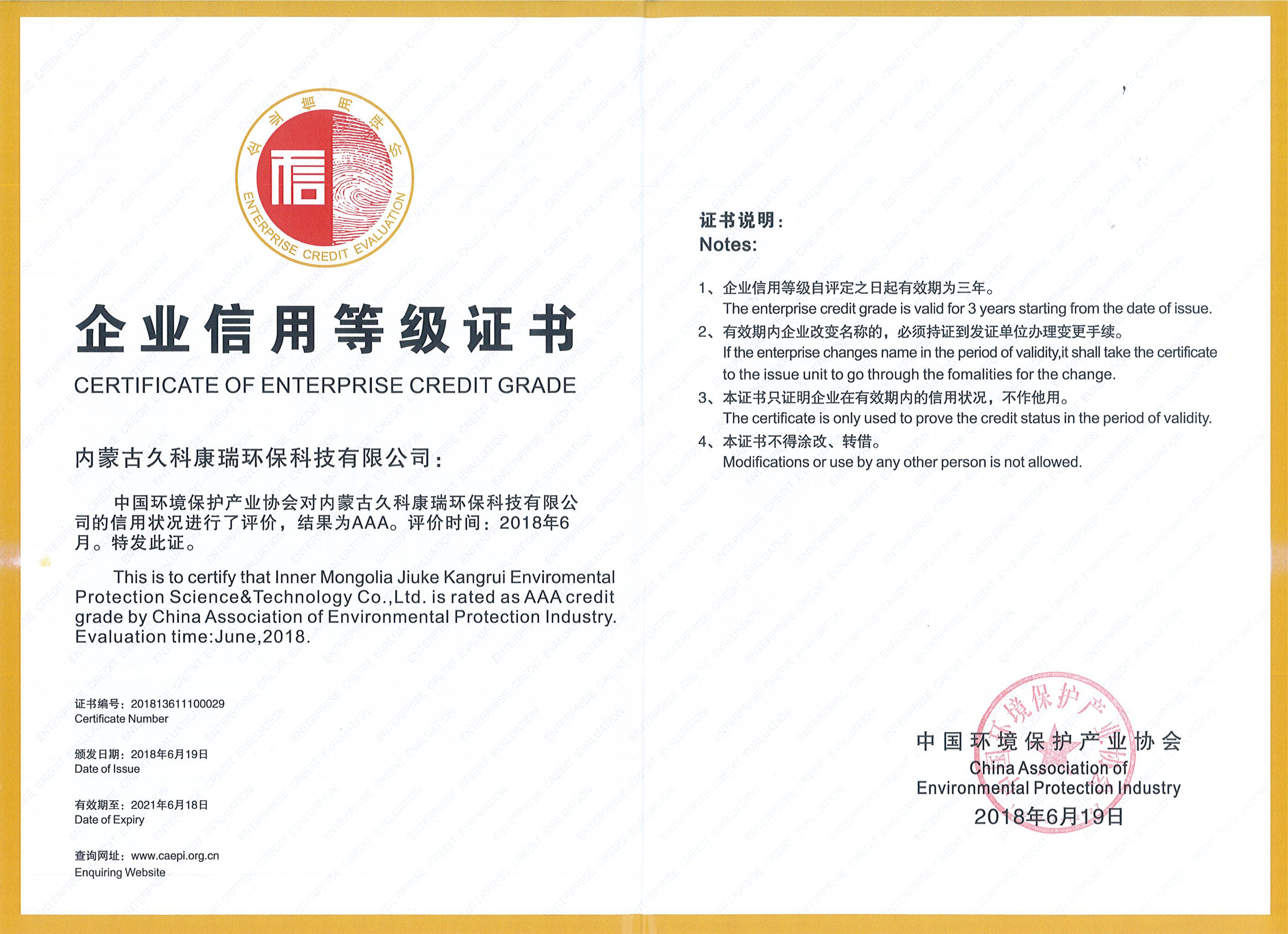 久科环保经过中国环保产业协会信用评价办公室和信用评价专家委员会的严格评价,并通过协会信用评价工作委员会的实地审核,被评为企业信用评价等级AAA。